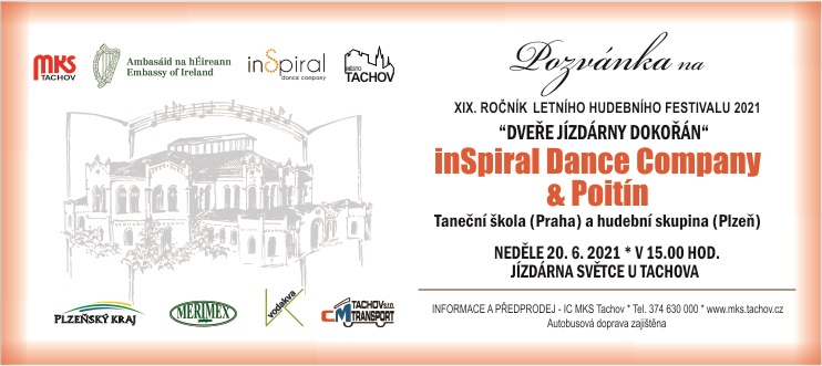 TACHOV:  Městské kulturní středisko Tachov zve diváky na zahajovací koncert 19. ročníku letního hudebního festivalu roku 2021 – do Jízdárny ve Světcích. Nabízí nevšední hudební a taneční vystoupení věnované klasické irské hudbě s tanečníky zaměřenými na irský step. Akce se uskuteční v neděli 20. 6. od 15 hodiny. Na pódiu se představí pražská taneční škola inSpiral Dance Company a plzeňská skupina Poitín.