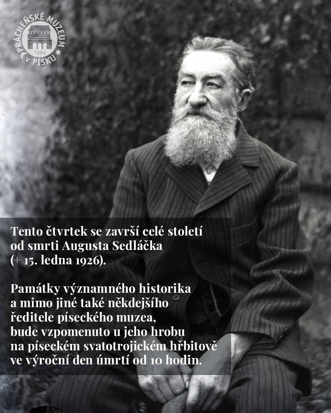 PÍSEK: Navzdory lednovému uzavření expozic Prácheňského muzea pro veřejnost pravidelné čtvrteční přednášky pokračují. 15. ledna 2026 to bude na den přesně 100 let, co v Písku zesnul věhlasný profesor August Sedláček. Historik, bývalý ředitel muzea a autor monumentálního díla Hrady, zámky a tvrze království českého je nejenom čestným občanem města, ale v Písku má i svou ulici, turistickou trasu, hrob či pamětní desku. Od roku 2023 se po něm dokonce jmenuje planetka.