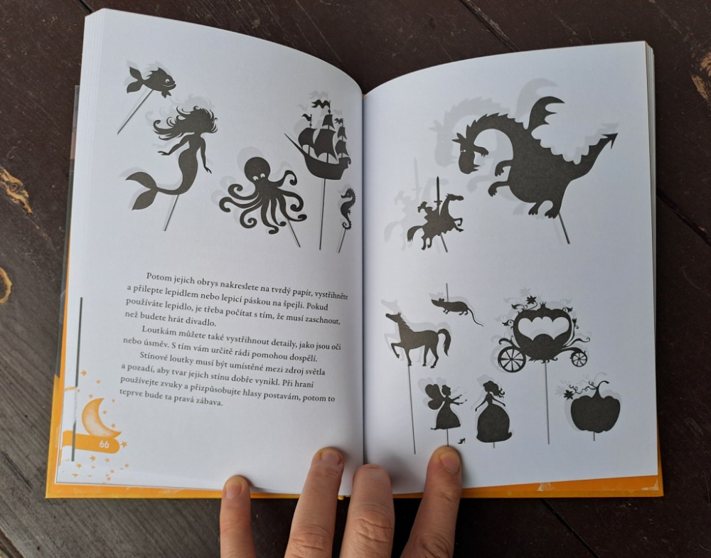 Najdete v ní spoustu návodů na stínové hry, zvířátka, tipy, jak si se stíny hrát přes den i po tmě a také velkou hromadu klasických i autorských pohádek, které můžete se stínovými loutkami hrát. Prožijte krásné pošmourné večery bez obrazovek, se společnou legrací a tvořením.